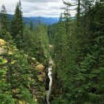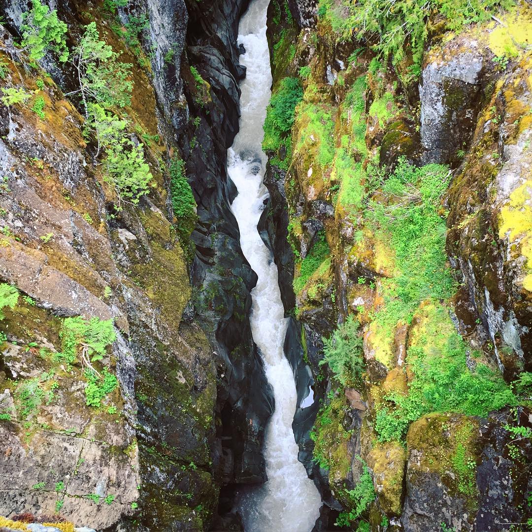 Many other people had the idea of getting away from it all. We skipped a heavily mobbed stop with the same sort of large trees we had seen in Alaska, instead pulling off at the much quieter Box Canyon for a small loop trail showing mossy rocks shaped by glacial ice.