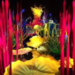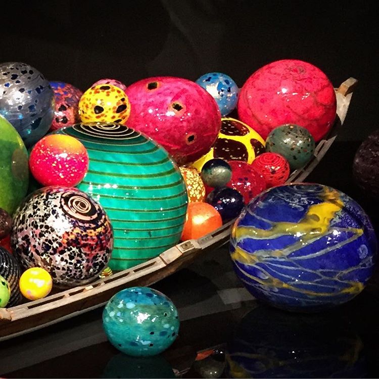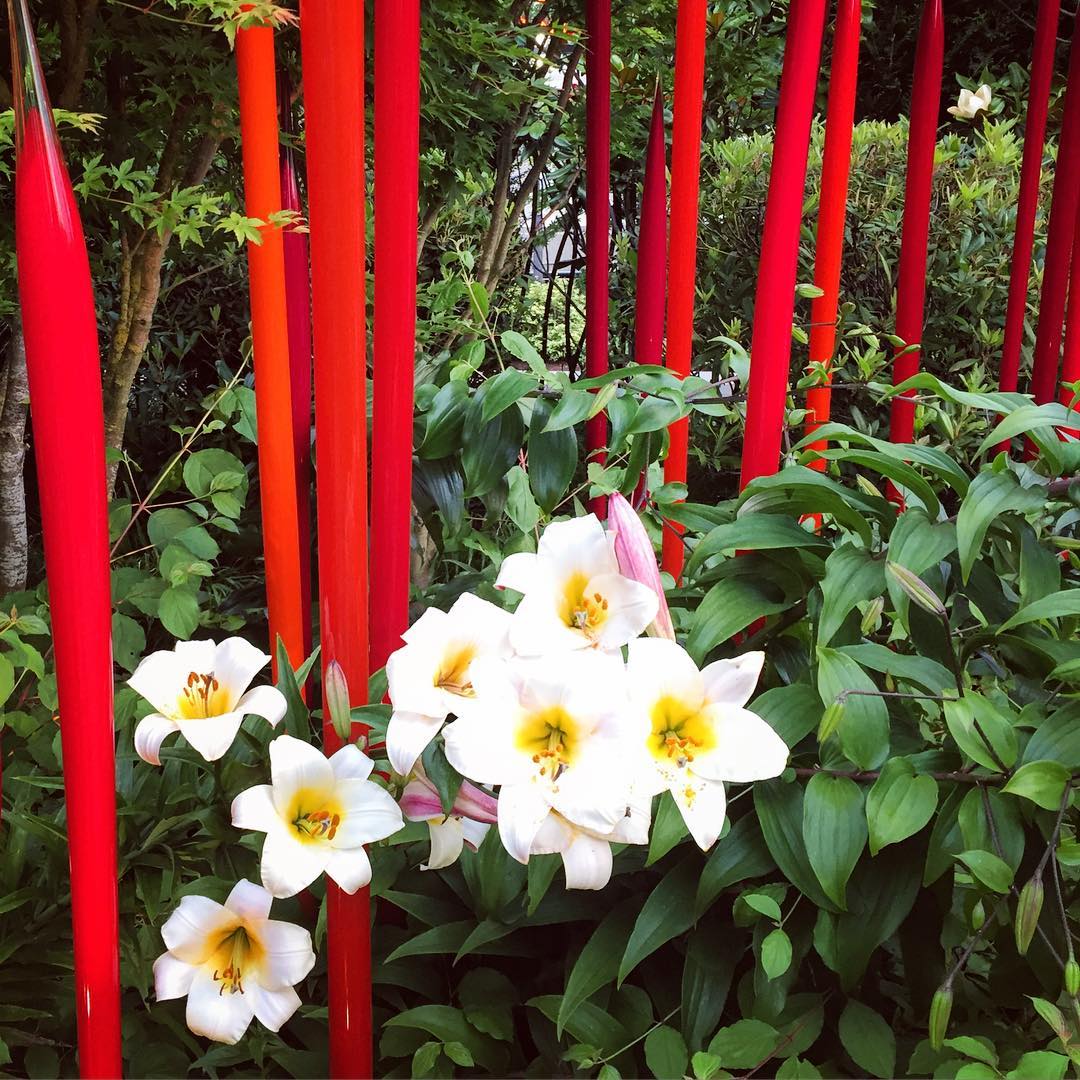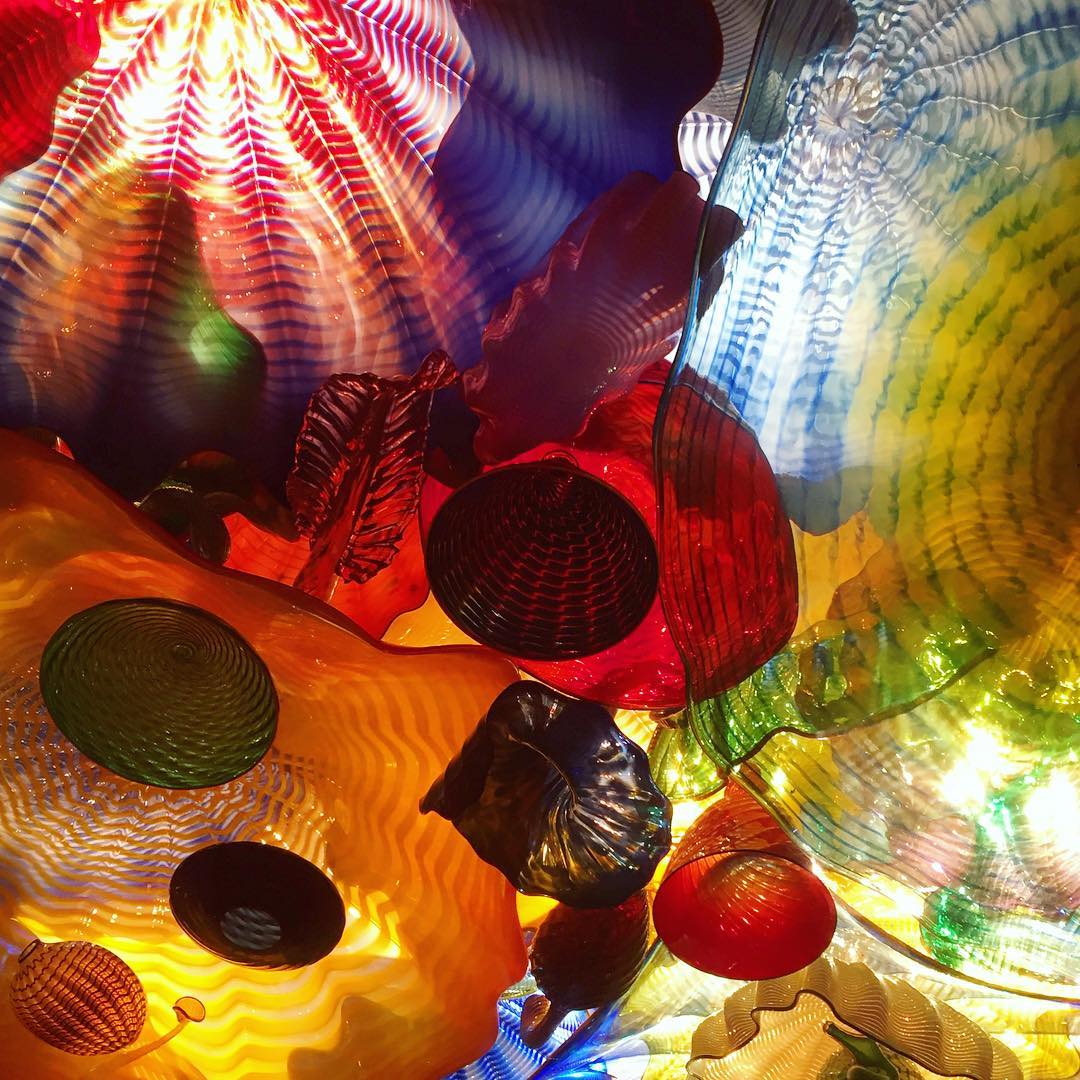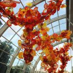 Chihuly Garden and Glass, another item on my Seattle wish list, was still open with plenty of time to browse. Scott had never been inside, so it would be new to him as well. Some years back, I had seen Dale Chihuly’s work when it traveled to Phipps Conservatory in Pittsburgh. This museum featured similar arrangements of glass and greenery plus a variety of standalone pieces and installations. Of particular note were the massive dark room arrangements – one was a garden of its own – and a variegated ceiling which cast watery rainbow lighting on the white walls and floor.