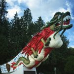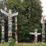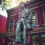 We took an Aquabus ferry across False Creek to Granville Public Market, located in an area reclaimed from industry. Spousal Unit and I shared an Indian food sampler, bean burrito, and salted caramel gelato, plus fun conversation with other travelers at our table. We ultimately rode through Chinatown, Gastown, and Yaletown, learning the context of assorted details seen on the prior night’s wanderings. Gastown was named after Gassy Jack, the first saloon owner in Vancouver, so called for his storytelling habits and not necessarily for flatulence. The red and gold streetlights in Chinatown were commissioned by the city to give the neighborhood a distinct visual identity. A monument honored Chinese-Canadian railway workers and veterans of World War II.