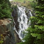 Spousal Unit, Scott, and I took a short paved trail to the gorgeous Myrtle Falls, after which Scott ran ahead and away from the crowds. We followed the more rugged path up its slope, avoiding deep muck and finding traction on pocked patches of snow, but stopped when the trail became covered with snow and fog. Scott was well out of sight – we hoped he had some clue of where he was going if he meant to hike the full long loop. As we later learned when meeting up at the visitors’ center, he turned back a short while beyond that point after doing some casual glacier climbing.