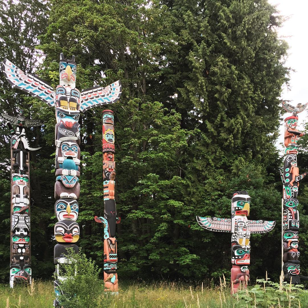 In the morning, Andrew, Dustin, Glenda, and Spencer joined Spousal Unit and me for Cycle City’s Grand Tour, which turned out to be everything I had hoped for. The route covered a great deal of varied ground on one long loop and showed us much more than we would have seen in five hours if left to our own devices. We rode along the seawall of Stanley Park, where stray logs wash up on the beach and the city arranges them into makeshift benches. In the park, we saw totem poles, the stunningly reflective Beaver Lake, one of the few remaining old growth trees that escaped logging from the British, and a replica figurehead of the Empress of Japan, an ocean liner once serving as the primary link between Vancouver and East Asia.