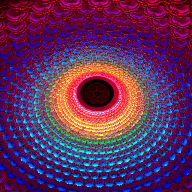 Rainbow lighting brings contemporary verve suited to the overall dignity. The ceiling in the great hall changes color, as does that of the huge circular meeting hall.