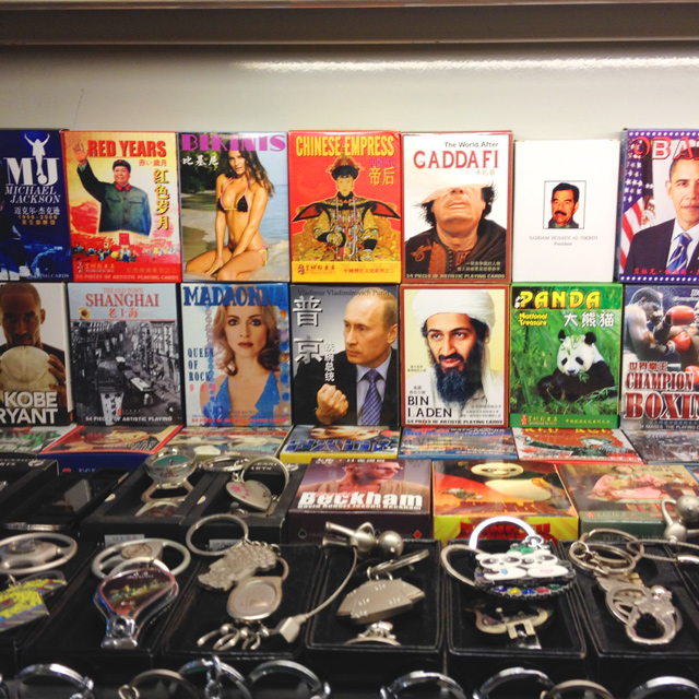 The next day, we had our final infomercial – a carpet factory well out of everyone’s price range and impulse buying instincts. At least it had the visual interest of an in-progress rug on display. Adjacent thereto was the worst meal of the trip – a Mongolian stir fry joint from the innermost circle of cross-contamination hell. The chefs loved to make a show of tossing food all around the circular grill and through everyone else’s detritus. I gave up on my inedibly meat-strewn dish and attempted to satiate myself on mixed vegetables, fruit, and cookies. The silver lining – an amusing variety of celebrity-themed merchandise, with pop stars, athletes, and Obama alongside the likes of Qaddafi, Putin, and bin Laden. It seems that any famous face will sell a pack of playing cards.